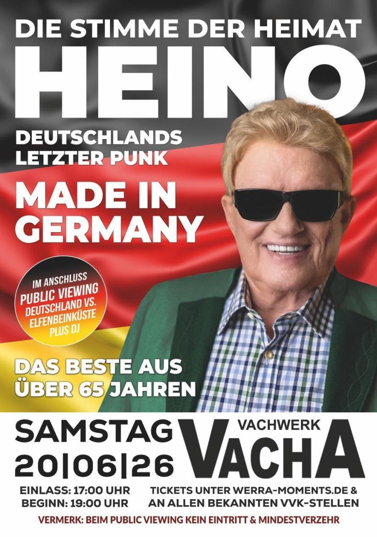 Deutschlands musikalische Legende geht 2026 auf große Konzert-Tournee! Unter dem Titel „HEINO – Made in Germany“ bringt der Kult-Star seine größten Hits auf die Bühne und gastiert im Rahmen die-ser Tour am Samstag, den 20. Juni 2026 ab 19 Uhr, auch im legendären Vachwerk in Vacha.