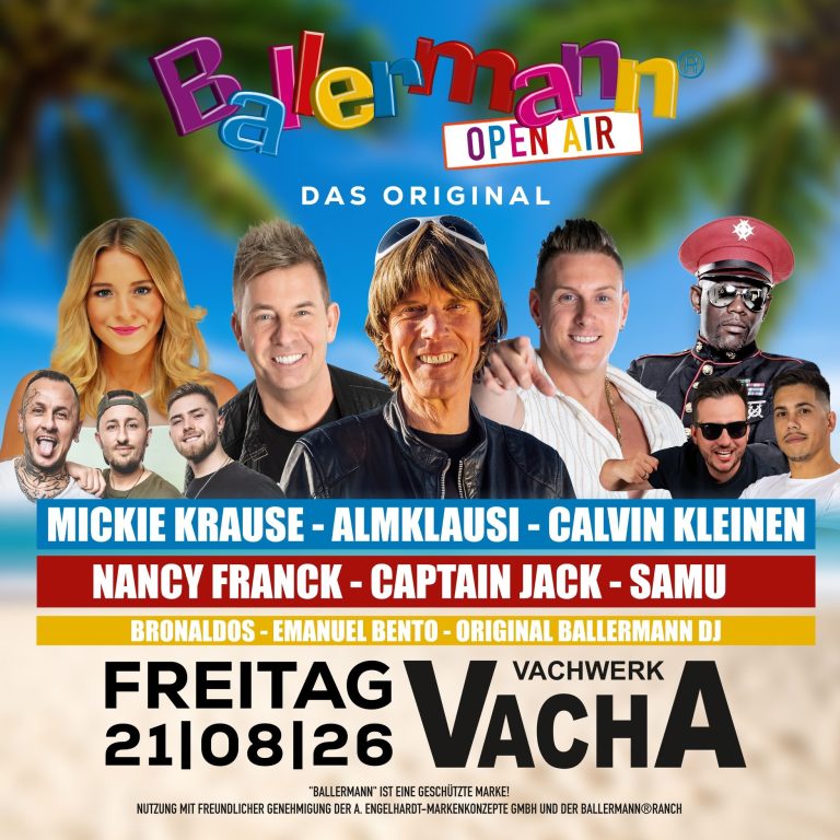 „Ballermann Open Air – Das Original“ steht für ausgelassene Stimmung, echte Stars und ein Event, das Erinnerungen schafft – von der ersten Konfettikanone bis zum letzten Beat. Ob eingefleischter Malle-Fan oder Feierbiest auf Heimaturlaub – hier trifft sich die Party-Community der Region. Und eines ist sicher: Diese Nacht wird legendär.